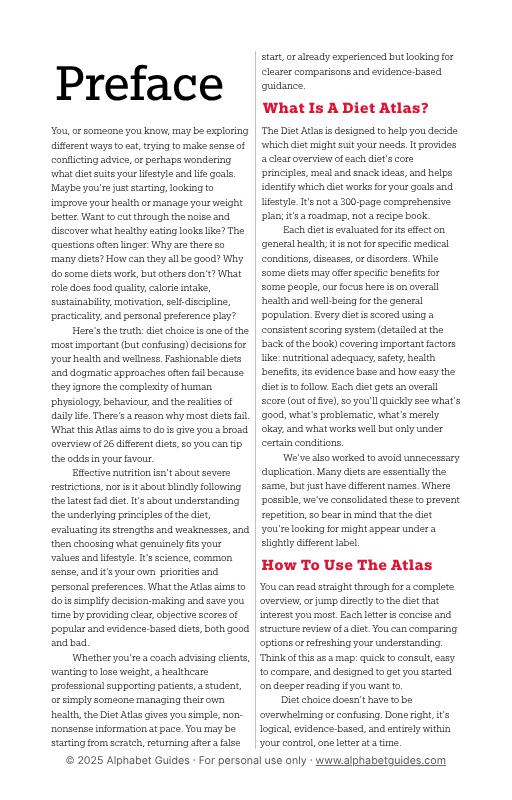 Instead of prescribing a one-size-fits-all meal plan, this guide helps you understand why different diets work for different people, and how to choose one you can actually sustain. Whether you’re new to nutrition, advising others, or refining your own approach, the Diet Atlas helps you navigate the complexity of healthy eating — one letter at a time.