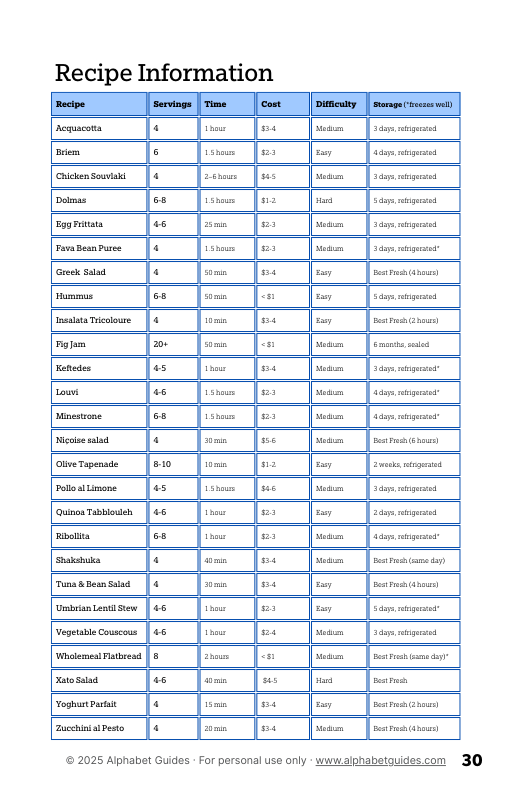 7. Storage times, equipment needs, and allergen information for all 26 recipes.