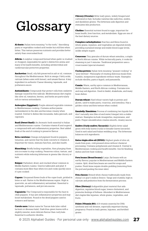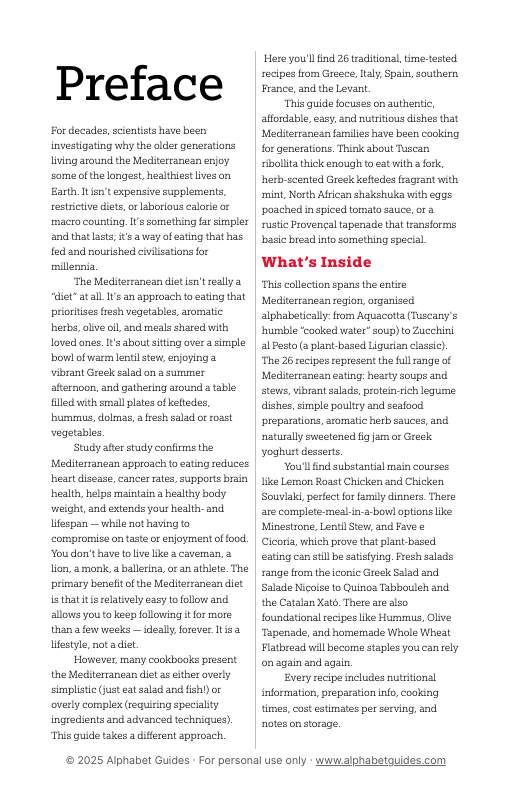 Discover the real health benefits of Mediterranean eating with 26 authentic recipes from Greece, Italy, Spain, Southern France, and the Levant. The Mediterranean Diet Recipe A to Z Guide features traditional dishes that actual Mediterranean families have cooked for generations:: from hearty Tuscan Ribollita and Greek Keftedes to fresh salads, filling bean stews, and flavourful herb sauces.